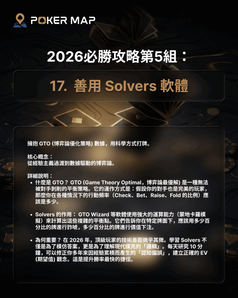 by nnaa00 in 2026-01-092026-01-20 撲克攻略 想在 2026 年成為牌桌上的常勝軍嗎?光靠感覺打牌已經不夠了!現代撲克強調數據分析與環境選擇,這組攻略將帶你進入專業玩家的世界,學習如何利用工具與智慧,提升你的贏利上限。 結合科技與智慧,讓你的撲克之旅更有效率! 相關 Tags: 2026攻略, GTO, GTOwizard, POKERMAP, Solvers, TexasHoldem, 德州撲克, 撲克策略, 桌子選擇, 現代撲克 nnaa00 Share Post: Facebook Pinterest Related Posts 撲克攻略 新手必備!德州撲克「牌型大小」懶人包! 撲克攻略 對抗決策疲勞的職業級戰略